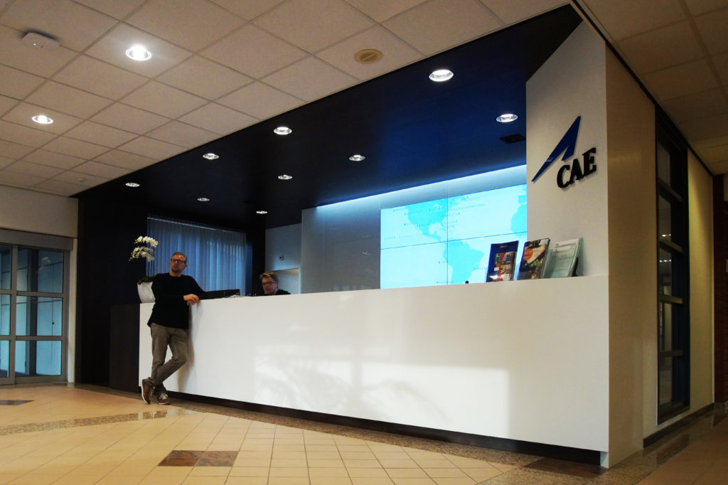 In de entreehal van het Training Center van CAE is een nieuwe balie geplaatst. Het ontwerp van de balie en de hal door BOP architecten is zakelijk. Met een strak uiterlijk en met een hoogwaardig en moderne afwerking is de balie voorzien van alle technische hoogstandjes.