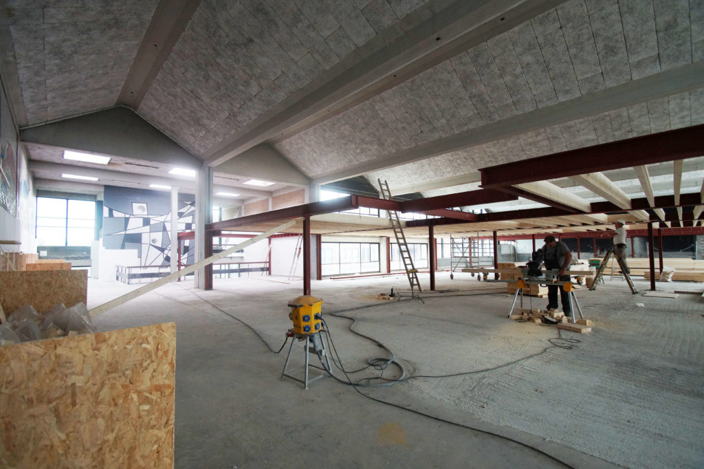 De constructie van de nieuwe vloeren voor de startersappartementen in de voormalige aula van de Haarlemse School zitten er bijna in.