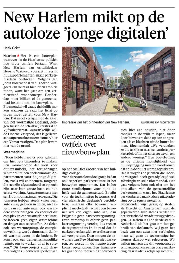 Prachtige tekening in het Haarlems Dagblad van het kunstwerk van Hans Wiesman op het trappenhuis van de aula van de oude St. Petrus LTS die door BOP architecten wordt verbouwd tot appartementengebouw.