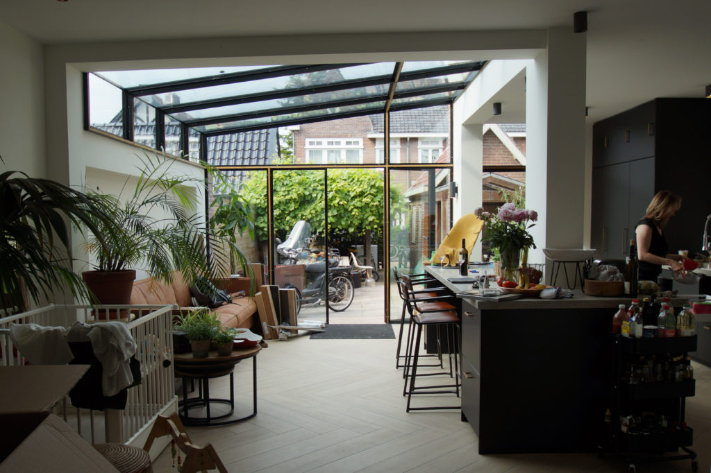 Voor het grote gezin hebben we een lichte leefkeuken ontworpen. Door het glasdak te knikken en lager te maken is voldaan aan de wens van de opdrachtgever om tijdens het koken nog naar buiten te kunnen kijken. Slanke stalen profielen met houten dilataties zorgen voor de industriële sfeer.
